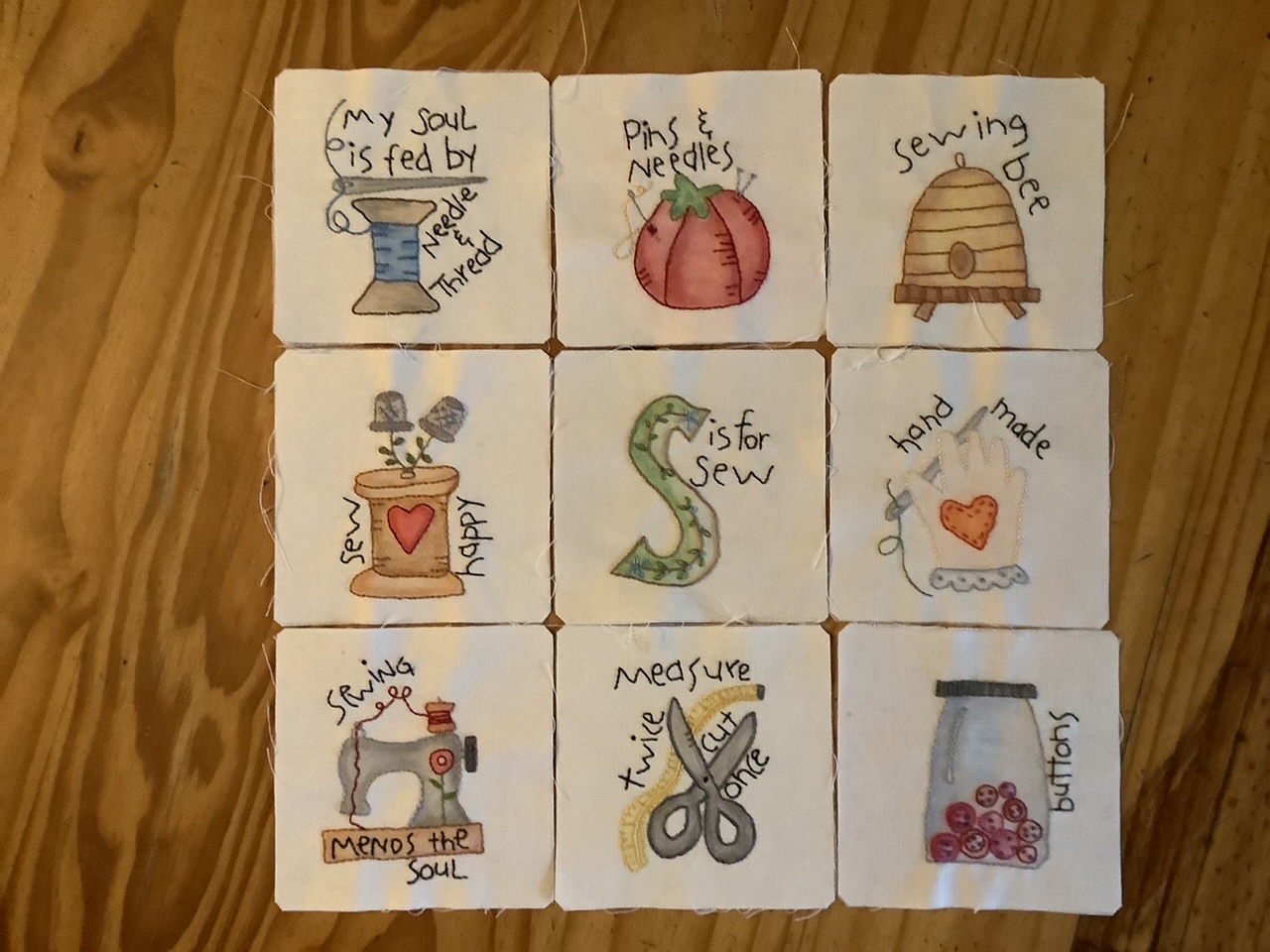 Sur le site de Woolen Spool Designs j’avais téléchargé un free « S is for sew » et j’avais réalisé la bobine avec du bleu et du marron... crayons offert lors d’un atelier au Portugal et puis j’avais reporté les autres motifs.